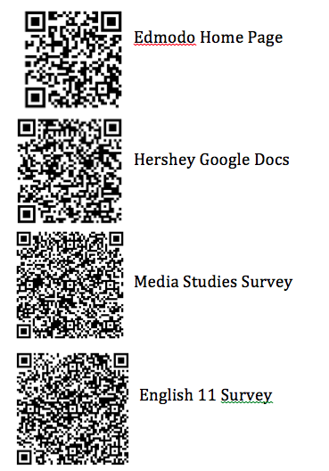 This year was our second year with a BYOD (Bring Your Own Device/Technology) policy at the high school. Rather than keep them writing on the paper cards, I decided to instead convert my survey to a Google Form and print out the QR code for them to scan and access the survey instantly. I also put the links for the Edmodo and Google Docs home page as a QR codes.